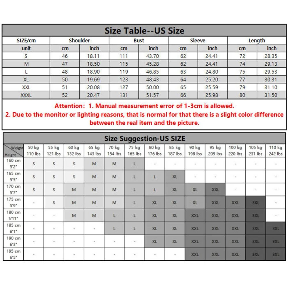 | size_info | {"sizeInfoList":[{"length":{"cm":"46","inch":"18.11"},"size":"US S 50-60 KG","vid":-1},{"length":{"cm":"47","inch":"18.50"},"size":"US M 60-70 KG","vid":-2},{"length":{"cm":"48","inch":"18.90"},"size":"US L 70-80 KG","vid":-3},{"length":{"cm":"50","inch":"19.69"},"size":"US XL 80-90 KG","vid":-4},{"length":{"cm":"51","inch":"20.08"},"size":"US XXL 90-100 KG","vid":-5},{"length":{"cm":"52","inch":"20.47"},"size":"US 3XL 100-110KG","vid":-6}]} |