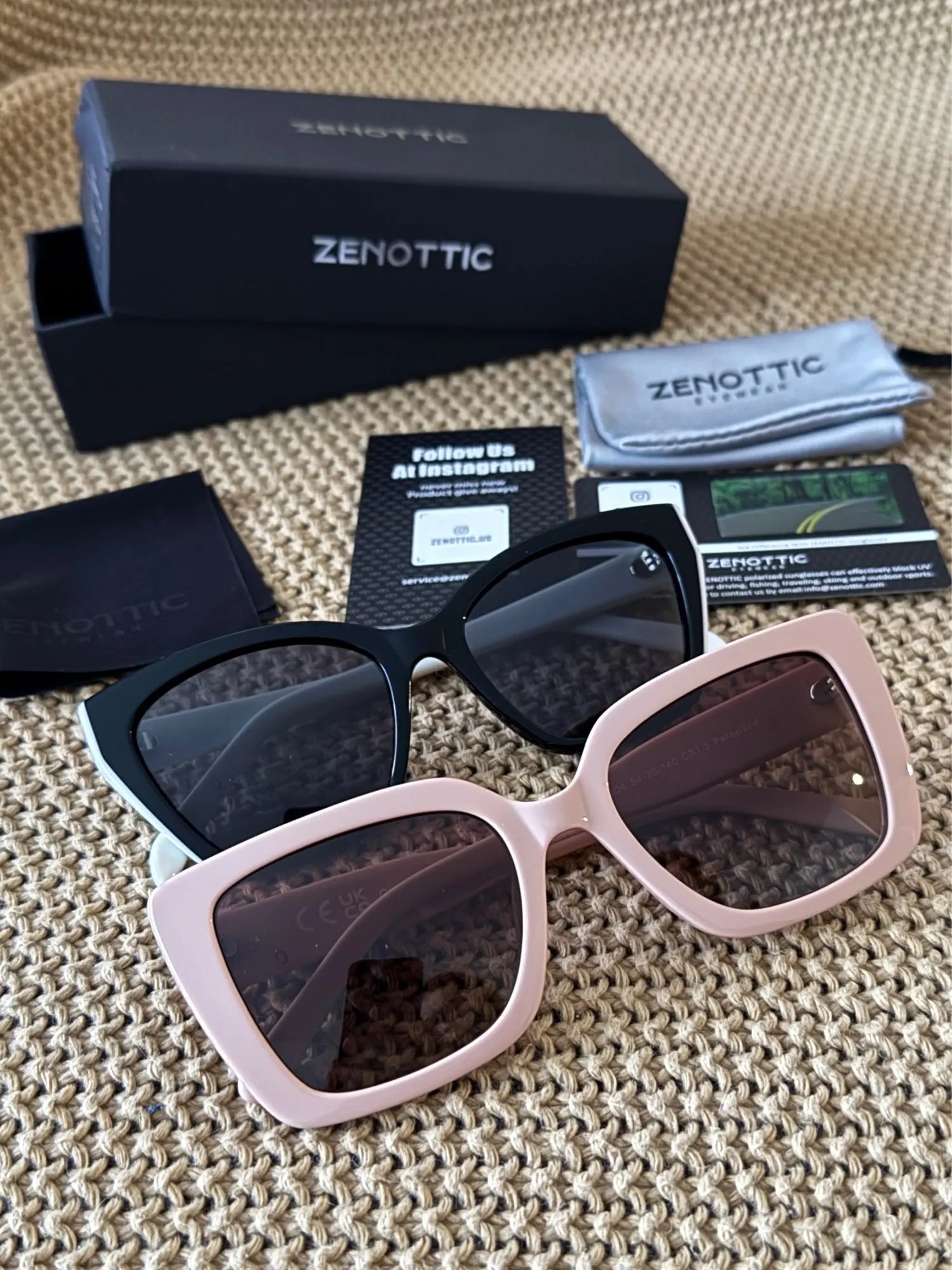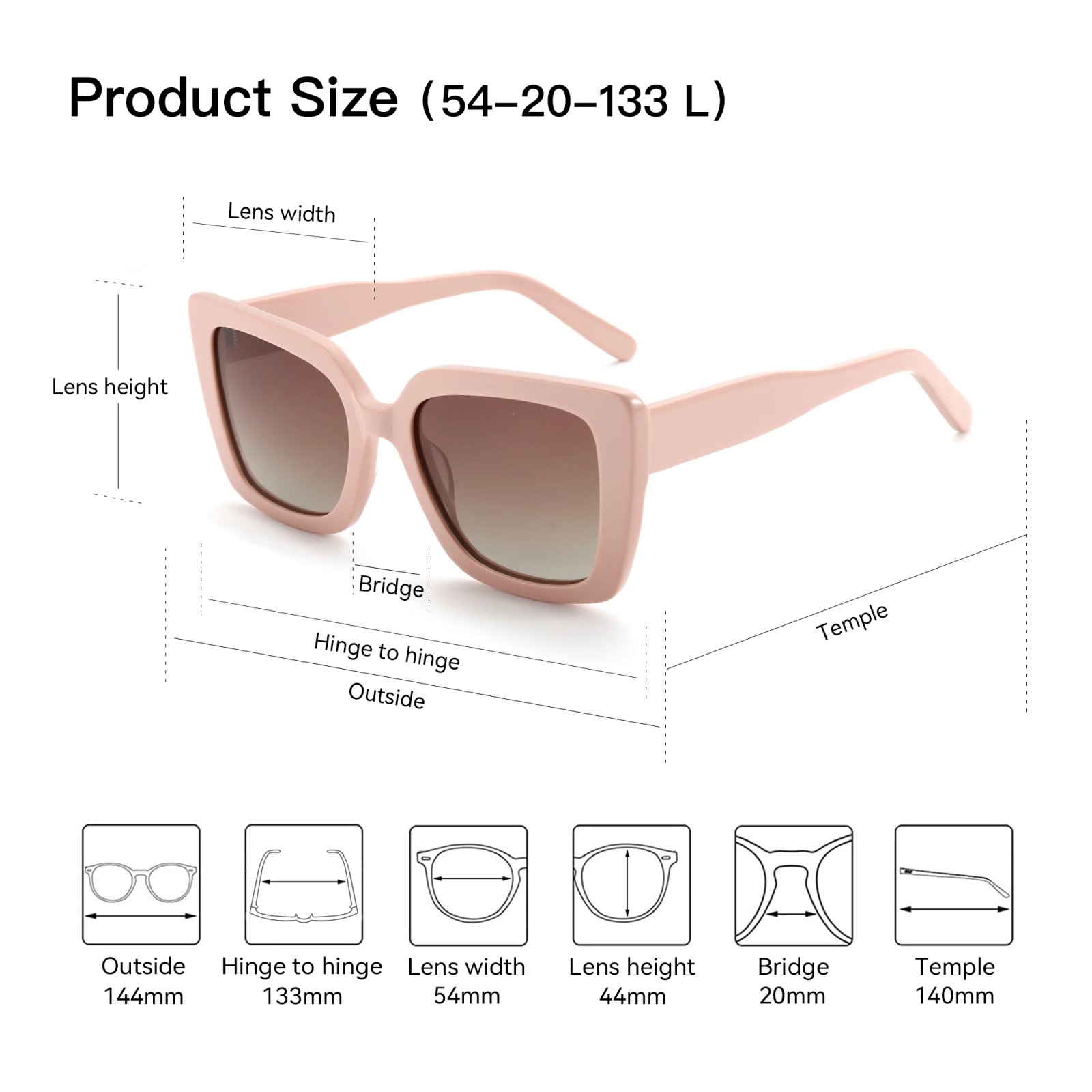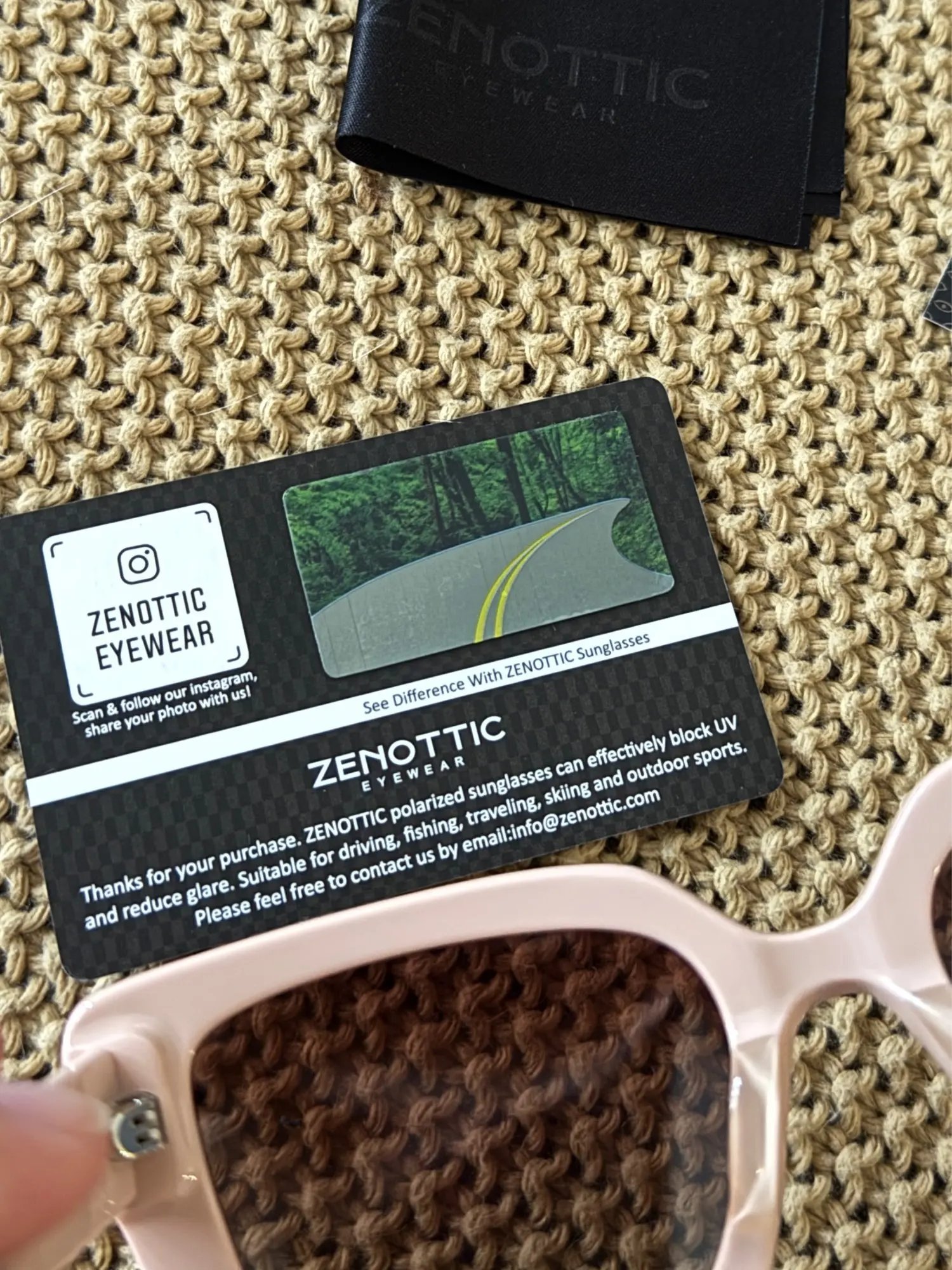 My second pair from the brand. This model is cool, fits super comfortably. The size matches our expectations and imagination. The material is thick glossy plastic in beige-pink color. The temples are not tight; when folded, they fall on the frame, not the lens. There are no logos or inscriptions. The set included a fabric case, a cloth, a card for checking the coating, and a business card. The lenses are polarized, gradient. The packaging wasn’t entirely good; my box arrived wrinkled and torn. The contents are fine, though. I recommend this model 👍🏻
