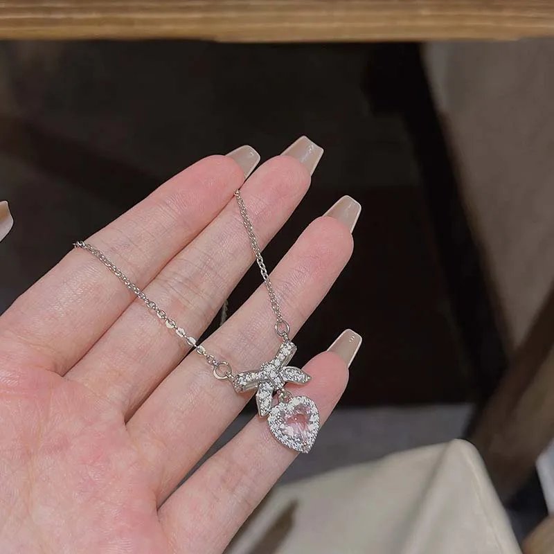 Pink Crystal Heart Bow Tie Pendant Necklace